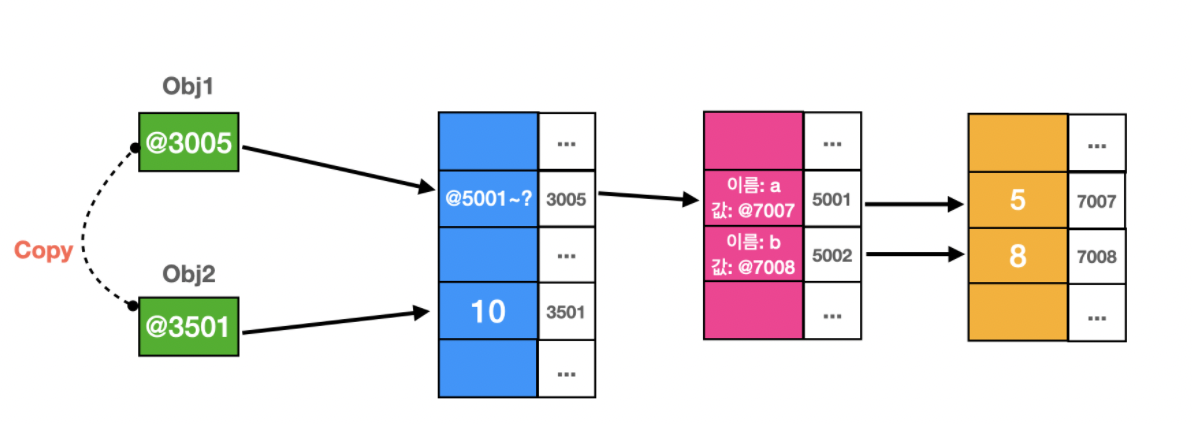 이처럼 함수 내부의 obj2 = 10;에서 obj2의 주소값이 10이 저장된 위치의 주소값으로 변경된다. 결론적으로 두 객체는 다른 객체이다. 때문에 JS는 call by sharing이라는 용어를 사용하기도 한다.
