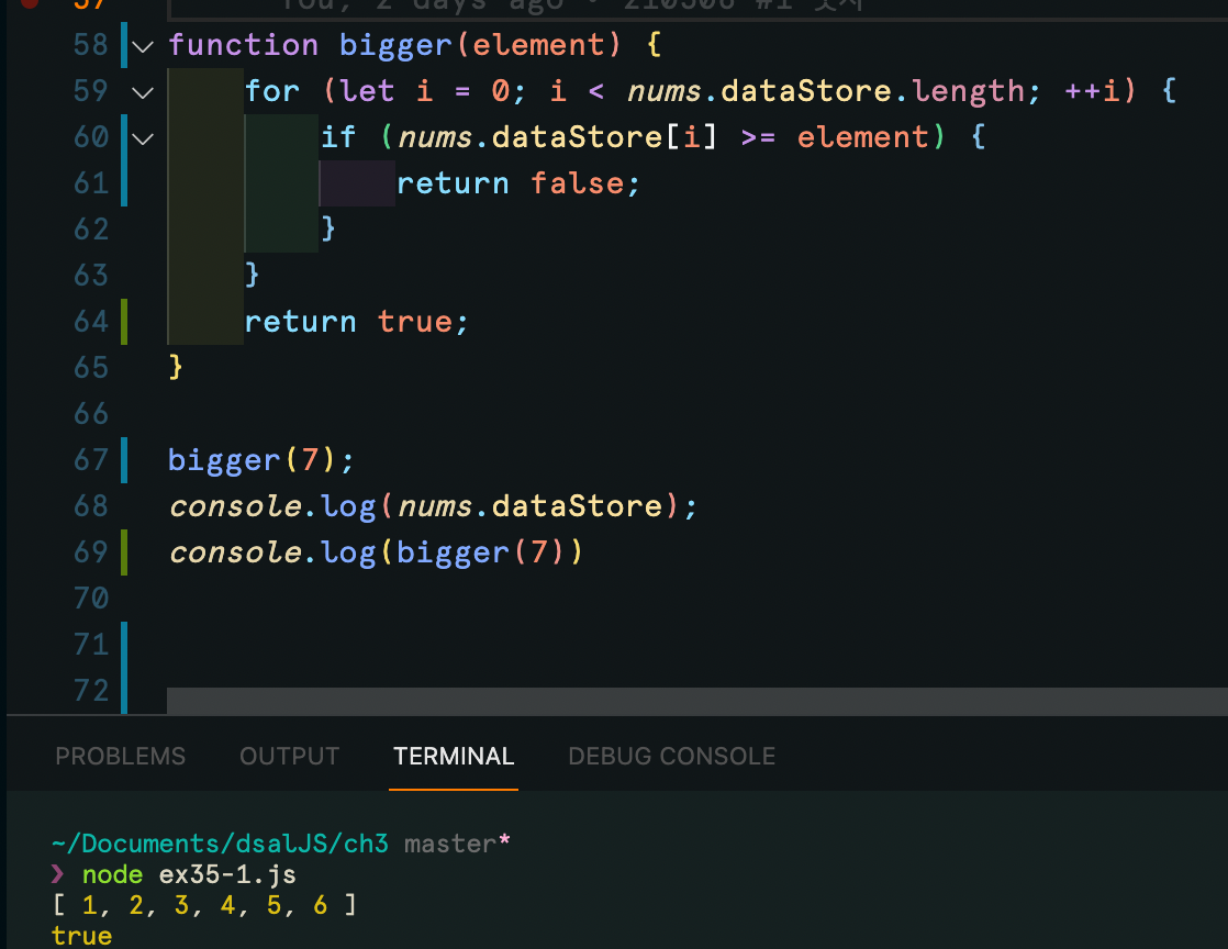 모든 요소보다 삽입하려는 요소가 큰지 확인하여 끝까지 확인했을 때 return true를 반환하고 중간에 삽입하려는 요소보다 큰 요소가 존재할 경우 false를 리턴하는 함수 bigger()을 구현했다.